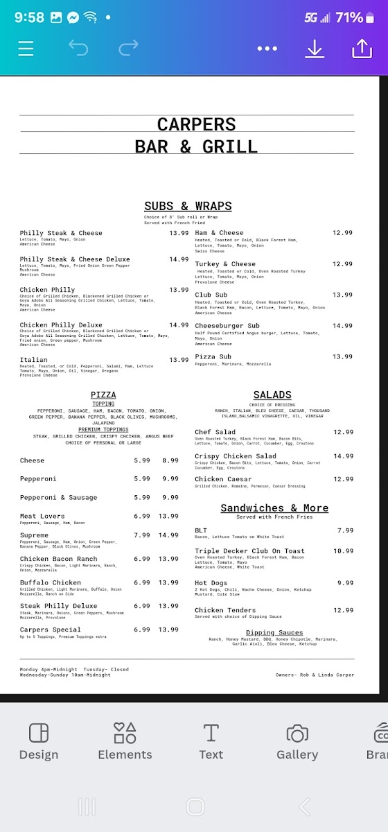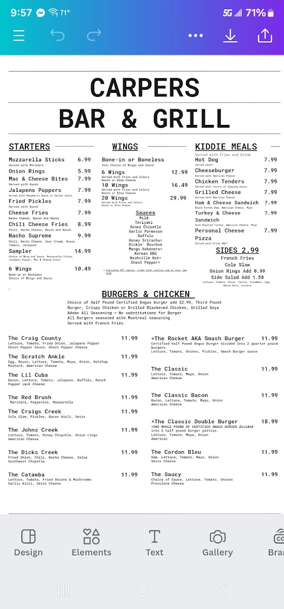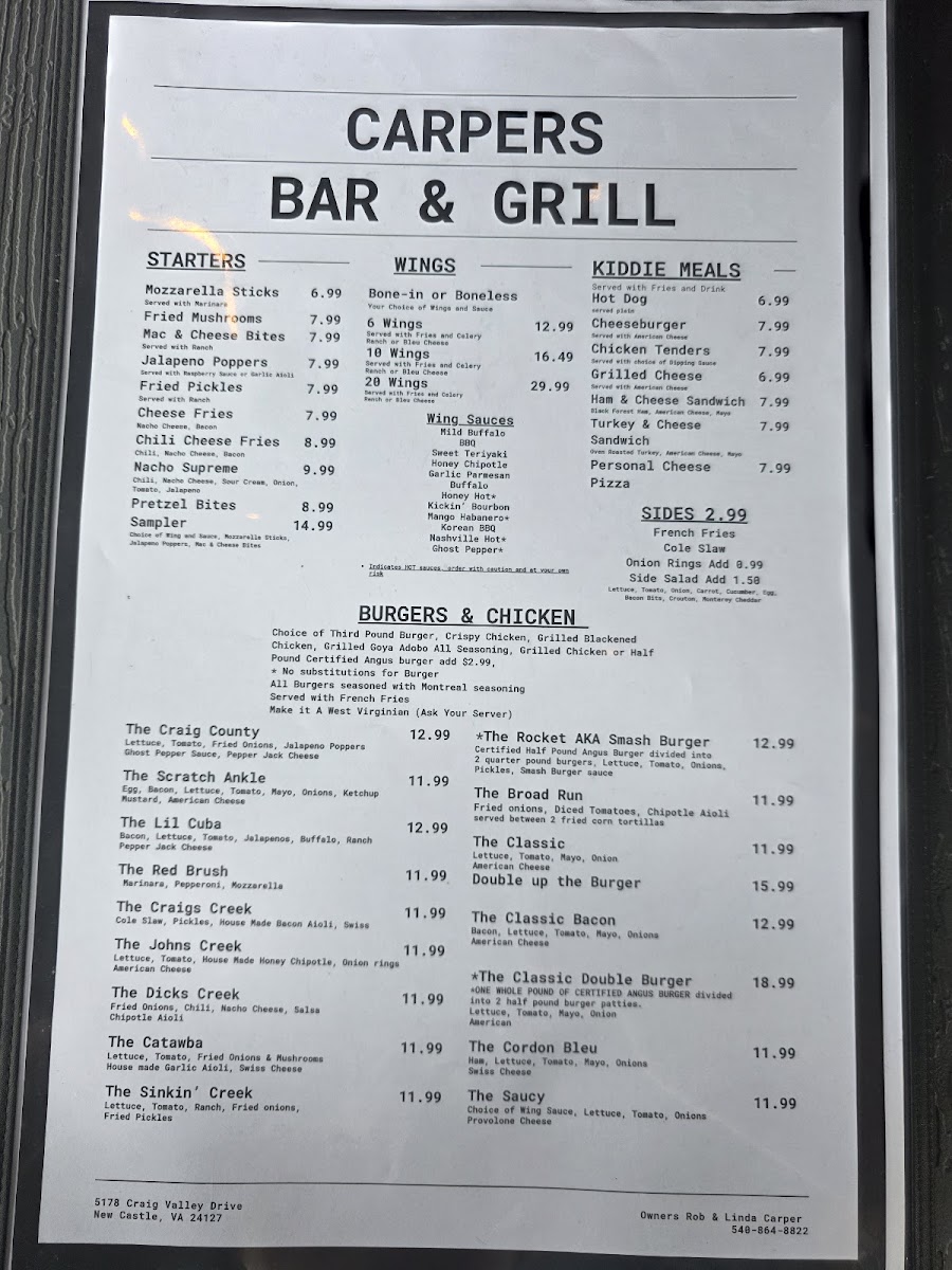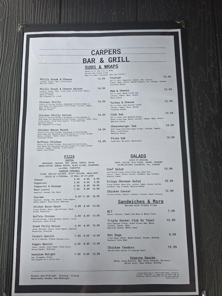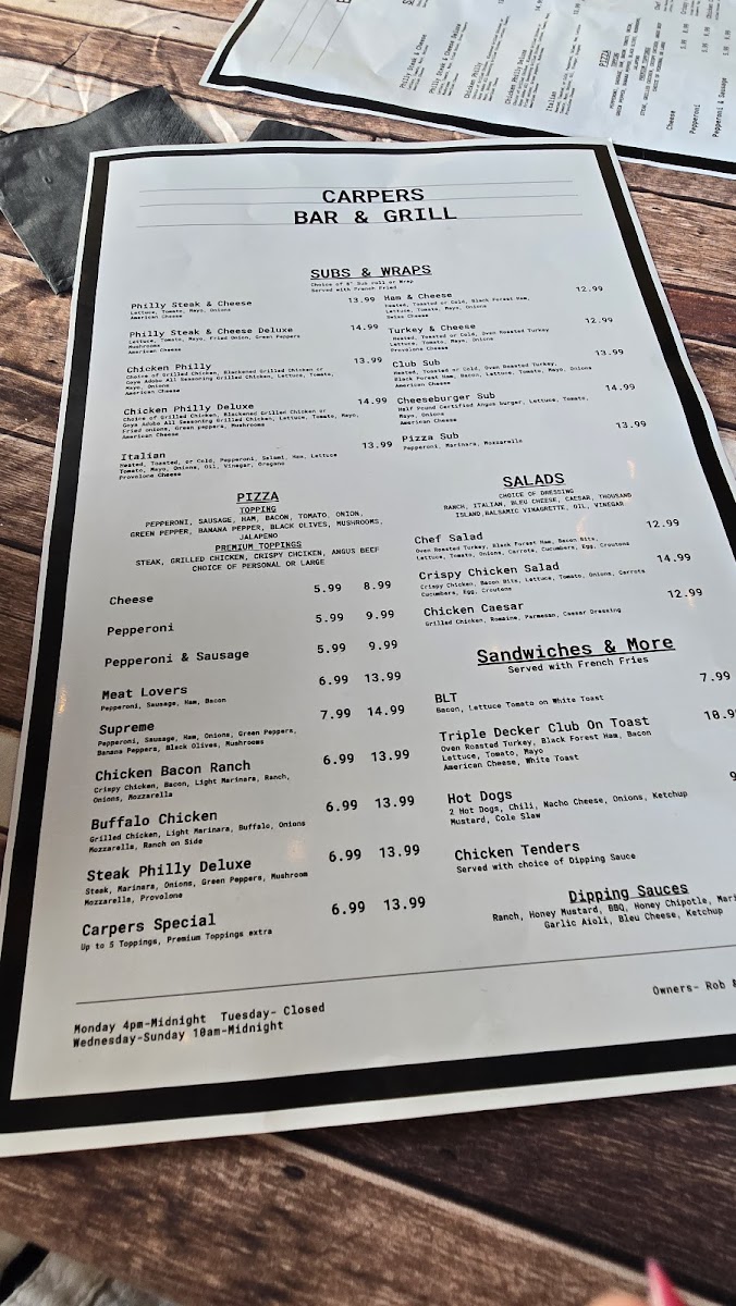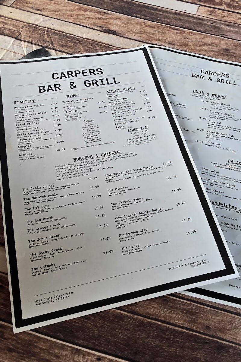 Carpers Bar & Grill Menu